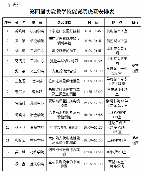 决赛时间定于本学期第八周星期四(10月23 日),分别在草堂校区和雁塔校区依次进行,详细安排见附表。